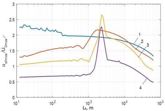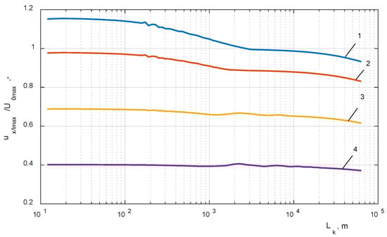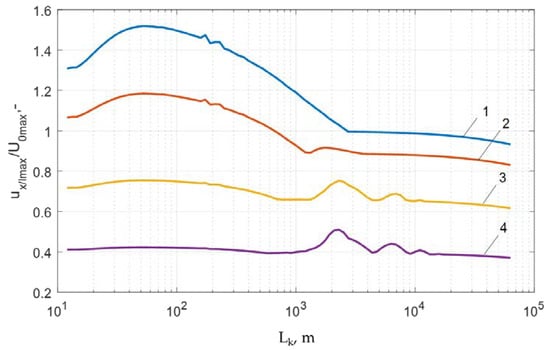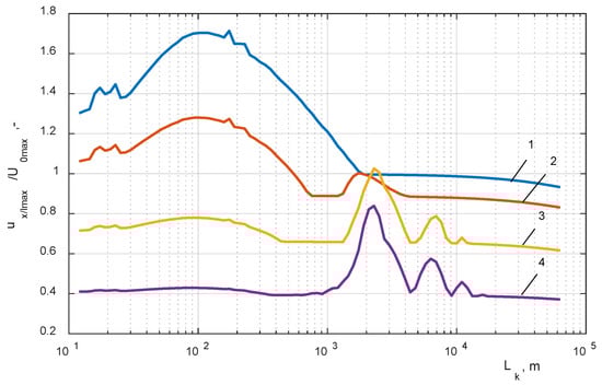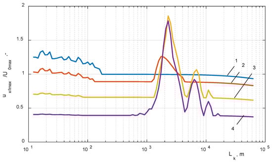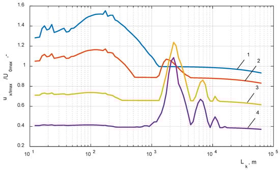 Characteristics of overvoltage maximal values ux/lmax/U0max = f(Lk) in relation to the cable length Lk determined at selected points x/l of the HV winding, in the case of a switching operation of a circuit breaker: 1, x/l = 0; 2, x/l = 0.18; 3, x/l = 0.33; 4, x/l = 0.62.