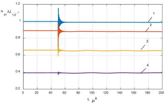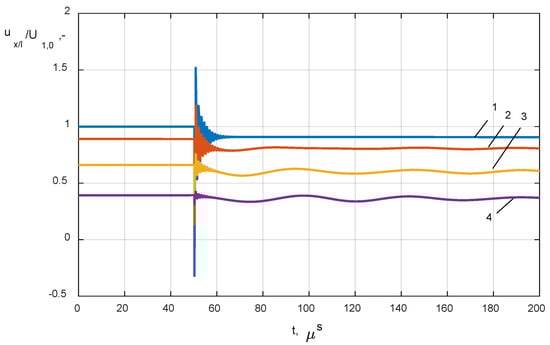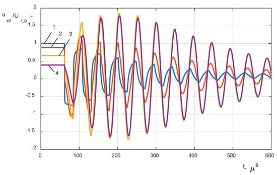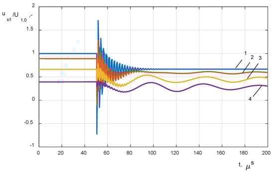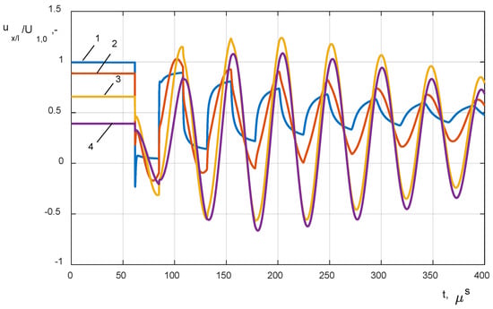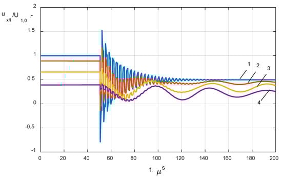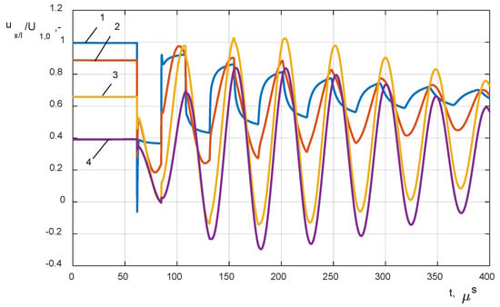 Waveforms of overvoltages at selected points x/l of the HV side transformer winding during a single-phase ground fault Rf = 0.01 Ω low-ohmic fault, in the case with a critical cable Lk length 2291 m: 1, x/l = 0; 2, x/l = 0.18; 3, x/l = 0.33; 4, x/l = 0.62.