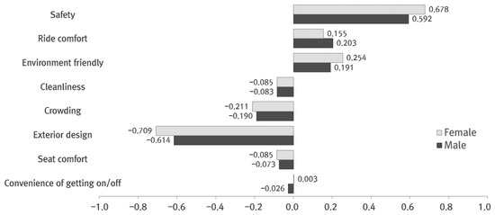 As a second topic, we analyzed gender differences in passengers’ preferences for electrified buses. There are differences in preference between males and females for several attributes, such as safety, ride comfort, environmental friendliness, and exterior design. Females attached greater importance to the safety and environmental friendliness of electrified buses than did males. According to a study by Egube (2012), females do not convince whether EVs are safe, compared to males [44]. From another aspect, females evaluated environmental consciousness as a more important attribute than did males [54]. With the results of previous studies, it can be assumed that gender differences in attitudes to and perceptions of electric-based vehicles have led to differences in preferences for the attributes of electrified buses.