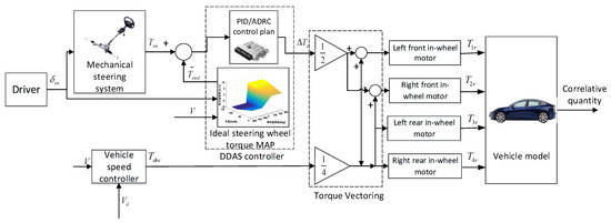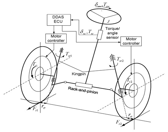 With the intensification of interest in environmental protection and energy issues, electric vehicles have ushered in significant development opportunities. Compared with traditional centralized drive electric vehicles, the torque of each wheel of an electric vehicle driven by several in-wheel motors, also commonly called independent-wheel-drive electric vehicle (IWDEV), can be independently controlled. Differential drive assist steering (DDAS) is a novel power steering technology based on the unique advantages of independent-drive of the electric vehicle driven by several in-wheel motors [1]. It uses the different driving force of two-side front wheels to generate steering assistance, which can substitute the traditional power steering system, such as hydraulic power steering (HPS) system or electric power steering (EPS) system. The reason is that the DDAS technology has the advantages of more compact structure and lower cost. Specifically, on the one hand, the DDAS system does not need an add-on actuator, like the steering motor of the EPS system. On the other hand, due to having the same actuators, the in-wheel motors, with the driving system the controller of the DDAS system can be integrated into the vehicle driving controller. Hence, the DDAS technology appeals to many researchers’ attention and interest.