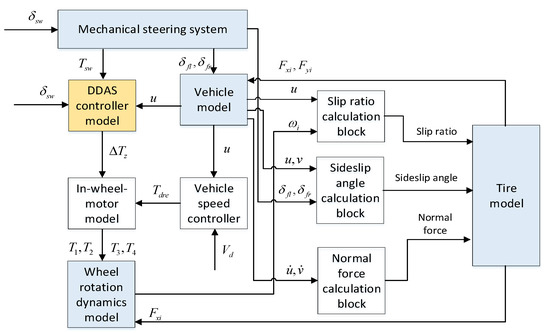 Figure 3 shows the overall framework of the independent-wheel-drive electric vehicle model, which is composed of a vehicle body model, mechanical steering system model, DDAS controller model, wheel rotation dynamics model, tire model and in-wheel-motor model, etc. The specific modelling processes of the core parts are shown in the following subsections, the DDAS controller model is introduced in Section 3, and for the others readers may refer to [1,10]. The descriptions of all the symbols of the variables can be found in the nomenclature section.