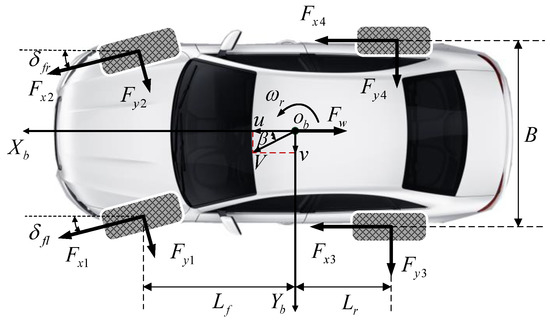 The vehicle body dynamic model established in this paper includes three degrees of freedom: longitudinal motion, lateral motion and yaw motion [1,10]. As shown in Figure 4, the following equations can be established:
