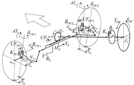 As mentioned above, the DDAS system maintains the mechanical steering system. The four degrees of freedom model of the steering system is shown in Figure 5. The corresponding dynamic equations of the steering system are shown as follows [11,12]: