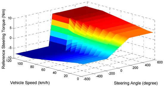 As for the driver’s ideal steering wheel torque, many research institutes have conducted a lot of researches very early, mainly through real vehicle test or driving simulator measurement. According to the previous research conclusion, the preference steering wheel torque characteristic of many drivers is closely related to the vehicle speed and the steering wheel angle [19,20,21,22]. Hence, as an example, a kind of driver’s preference steering wheel torque map derived from other’s experimental results is illustrated in Figure 8.