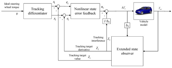 As discussed in Section 1, on one hand, the control effect of a conventional controller may be influenced by several interferences, such as inevitable steering wheel torque sensor noise and frequently changing suspension parameters as well as continuous road unevenness, while on the other hand, the change laws of these interferences are hardy to identify and accurately model. Therefore, PID control plans, especially the ones with fixed control parameters, as well as some robust and optimization control plan may not be competent for the DDAS control problem. As a result, the ADRC control method which has good robustness against inner parameter changes and outer sensor noise without knowing the accurate mathematical model of the controlled system in advance is proposed for the DDAS control system. Actually, as an improved PID controller, the ADRC controller treats the inner and outer interferences as a whole interference and the influence of the interference on the control effect is compensated by the disturbance estimation compensator. Therefore, compared with a PID controller, the ADRC controller has better anti-interference ability.