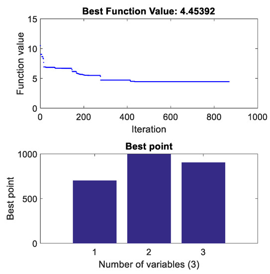 In summary, in addition to the empirically determined parameters, the other parameters which need to be specifically set are the following six parameters , , , , and . Generally, there is no relationship between the six parameters , , , , , and the parameters , , , , , , , mentioned above. At the same time, , and in the extended state observer are mainly related to sampling step size [23], which can be designed separately. In addition, and in nonlinear state error feedback are also important parameters of the controller and is an important parameter to characterize the difference of different systems. Due to the fact that there is a certain mutual influence between these parameters, and manual adjustment is too complicated, offline optimization to set the values of these six parameters is implemented. In this optimization process, three parameters , , are optimized first, and then the rest three parameters are optimized.