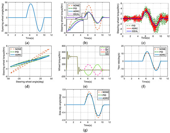 Sinusoidal input simulation: (a) Steering wheel angle; (b) Steering wheel torque; (c) Steering wheel torque with white noise; (d) Cross-plot of steering wheel angle and torque; (e) Wheel torque of ADRC controller; (f) Yaw rate; (g) Side slip angle.