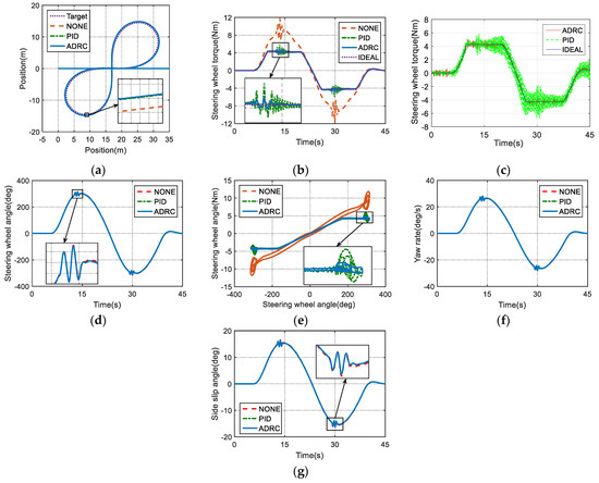 It can be seen from Figure 11b that both PID controller and ADRC controller have achieved good performance in power assistance. The maximum torque of the steering wheel dropped from 6.3 Nm to about 2.7 Nm, a reduction by 56%, so the effect is remarkable. Moreover, it is obvious that the steering wheel torque not only has a certain leading response, but also has a little big peak value with respect to the ideal steering wheel torque when the PID controller is adopted. The trend looks good, but the tracking accuracy of PID controller is a little poor. However, as a contrast, when the ADRC controller is used, the steering wheel torque can better track the ideal steering wheel torque, and almost has no difference in peak value with respect to the ideal value. In addition, Figure 11c shows the actual steering wheel torque curve after adding white noise to the steering system. It can be seen from Figure 11c that the chatter of the actual steering wheel torque when the PID controller and ADRC controller are adopted, respectively, is similar during straight line driving conditions, while during steering conditions, it is obvious that the chatter of the actual steering wheel torque controlled by the ADRC controller is smaller than with the PID controller. During the steering stage, the function of the ADRC controller of the DDAS system is to generate steering assistance for the driver and simultaneously mitigate the system noise interference on the steering wheel torque control performance. In contrast, the linear PID controller shows difficulties in dealing with the interference. The result proves that the ADRC controller has better anti-interference ability than the PID controller.