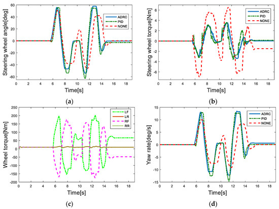 The simulation condition is selected as the sinusoidal steering wheel angle input without the driver’s steering model. First the vehicle gradually accelerates to 50 km/h and maintains this speed. As shown in Figure 11a, the vehicle is input a sinusoidal steering wheel angle at the 5th second and its amplitude and the frequency are 45 degrees and 0.2 Hz, respectively, and the road adhesion coefficient is set to 0.8. In order to verify the anti-interference performance of the proposed DDAS controller, the white noise model is used to imitate the sensor noise of the steering wheel torque, of which power and frequency are 0.01 and 27.5 Hz, respectively. During this procedure, two different controllers―one a PID controller, and the other the proposed ADRC controller―are used as two comparison simulation cases to control the DDAS system to assist the driver to steer the car. For better comparing their performance, the three parameters in the PID controller are also repeatedly calibrated after multiple groups of simulations with same sinusoidal steering angle input. Figure 11 shows all the comparison simulation results.