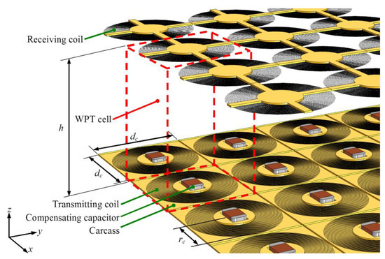 Among typical WPT devices consisting of several coils, systems with many inductive elements may also be considered. A pair of transmitting (TR) and receiving (RE) circular inductors at the distance, h, possessing identical radius, rc, and number of turns, nc, are the fundamental parts of the WPT cell with outer dimensions dc × dc (Figure 1). Windings are wound around a dielectric carcass with additional compensating capacitors. The periodic distribution of WPT cells (Figure 1) leads to transmitting and receiving surfaces where the energy transmission occurs. The transmitting surface consists of TR coils connected parallel to the sinusoidal voltage source (RMS value Ut), while RE coils are connected with individual loads, Zl.