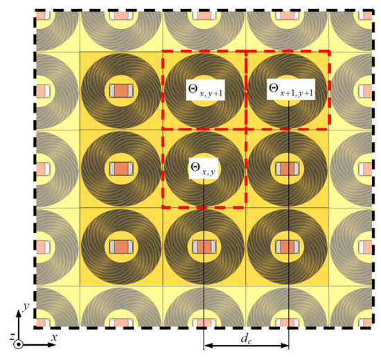 Proposed configuration enhances the density of transferred power in an area between transmitting and receiving surfaces. Furthermore, the energy supply conditions can be adjusted. For example, the simultaneous power transfer to many independent devices is possible, where each WPT cell is directly connected with individual energy storage. Another possibility is to connect parallel every RE coil to a single common energy receiver. The series connection of coils and intermediary parallel-series configuration are possible. An analysis of the periodic system can be reduced to the two-dimensional plane, xy (Figure 2), representing a set of TR or RE coils. The considered cell, Θx+a,y+b, is an element of an array with identical inductors, where a is the number of columns and b is the number of rows in a grid; a, b ∊ Z, and Z are the set of integers. Adjacent coils (e.g., Θx,y+1 or Θx−1,y) of element Θx,y are separated by the distance, dc. Magnetic coupling, which occurs between coil Θx,y and the others, is undesirable and affects power transfer efficiency between transmitting and receiving surfaces. Due to the small distance between coils (dc ≈ 2rc), magnetic coupling phenomena must be included in models.