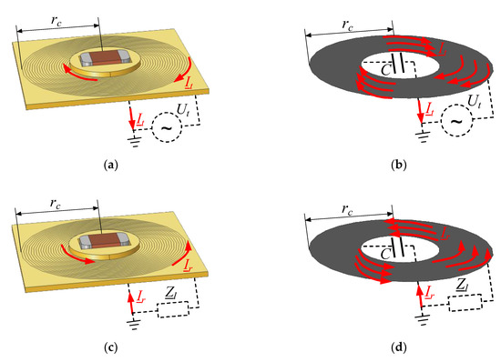 Models of multi-turn spiral coils: full model of (a) transmitting coil and (c) receiving coil; simplified model, using current sheet approximation method and attached electrical circuit for (b) transmitting coil and (d) receiving coil.
