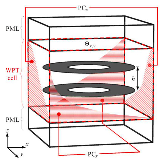 In order to simulate the periodic WPT system (Figure 1), all the cells forming transmitting and receiving surfaces have to be taken into account. However, for the system with many WPT cells (a, b >> 3), another simplification is possible. Assuming a, b→±∞ periodic boundary conditions (PC) both in x and y direction may be applied. Then, wireless charging system will be simplified to a single cell Θx,y, filled with air and containing a pair of transmitting and receiving coils (Figure 4). Periodic boundary conditions are applied on the left and right (PCx), as well as the front and back (PCy) boundaries, in order to project an infinite array of WPT cells. A perfectly matched layer (PML) is put at the top and bottom of the model, to imitate a dielectric background. The model is complemented by application of simplified multi-turn spiral coils with an attached part of the electrical circuit, as shown in Figure 3b,d.
