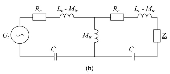 Circuit model of the WPT cell with identical transmitting and receiving coils: (a) general model of periodic cell and (b) simplified model of the cell for identical transmitting and receiving coil.