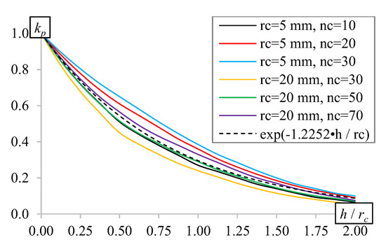 Periodic coupling coefficient, kp, for considered coils and different h/rc.