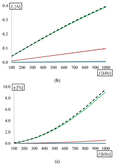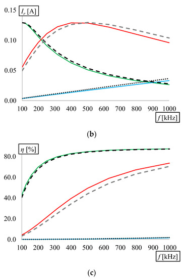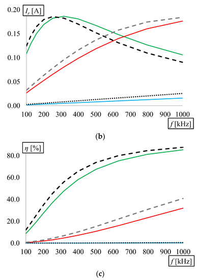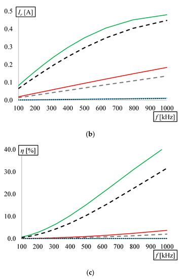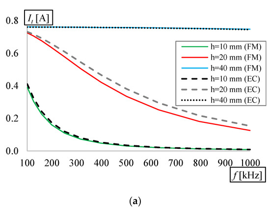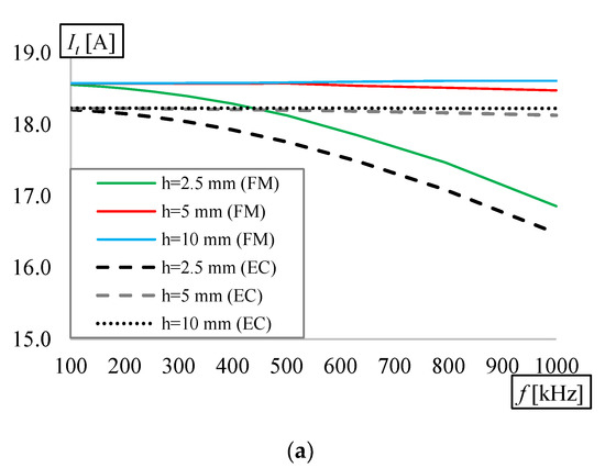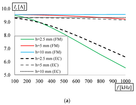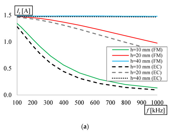 The highest efficiency and one of the best accuracies were obtained for nc = 70 (Figure 11c). The relative difference between currents for the least accurate case was 21.7% (h = 20 mm, f = 1 MHz). For the other distances, h results from FM and EC converged acceptably. Additionally, an analysis of Ir (Figure 10b and Figure 11b) at identical efficiencies, η, showed that higher power was transferred to the load when coils with nc = 30 were used. However, coils with nc = 70 achieved η ≥ 80% at lower frequencies.