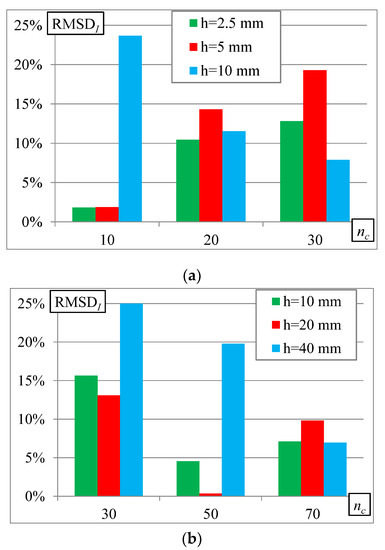where Nf = 10 was the number of frequencies for which the calculations were made. RMSDI was the combined difference between both currents at the entire considered bandwidth. The highest values (above 20%) were observed for nc = 30 (small and large coil) at h = 2rc (Figure 12). Similar results were obtained for rc = 5 mm, nc = 20 (Figure 12a), and rc = 20 mm, nc = 50 (Figure 12b); however, RMSDI was less than 20%. Discussed cases were related to systems, where the energy transfer efficiency was the order of a single percent (Figure 8c, Figure 9a–c, Figure 10a–c, Figure 11c); hence, presented differences had negligible practical significance. For the other cases, RMSDI varied from 1.8% to 19.3%, and in eight variants, it was less than 10%. The circuit model provided a high degree of compliance, especially for h/rc < 2, which were the distances between TR and RE coils, where the WPT system had the highest efficiency. Mean deviation for coil rc = 5 mm was 11.5%, and for rc = 20 mm, it was 13.3%. Obtained values indicated that the circuit model had comparable accuracy, despite the usage of smaller or larger coils. Thus, the proposed model can be used for an analysis of WPT cells with different sizes and numbers of turns.