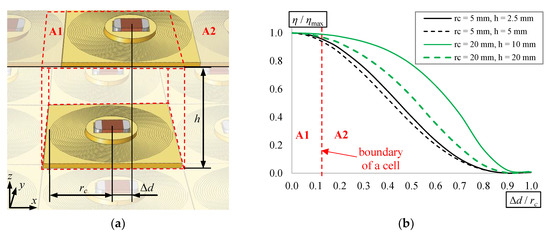 Additionally, an analysis of the horizontal misalignment (Δd) in the discussed periodic WPT system was performed. The numerical model was utilized to define the impact of Δd on relative change of power transfer efficiency η/ηmax, where ηmax is the transfer efficiency for Δd = 0. Two regions have been distinguished: area inside (A1) and outside (A2) the unit cell, as shown in Figure 13a. Computations at source frequency f = 1 MHz were performed for small-scale (rc = 5 mm, nc = 20) and large-scale coils (rc = 20 mm, nc = 50), where two distances (h = 0.5rc and h = rc) were considered.