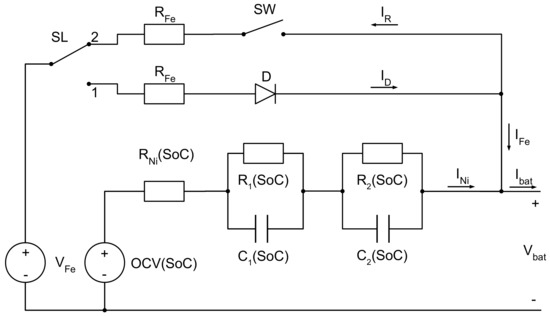 SL goes in position 2 and the iron branch is charged by the current I R if the switch SW is closed, when V bat > V Fe . SW is only closed if the total charge transferred by I D is larger than that transferred by I R , i.e., some already transformed iron material that can be reverted back is available. This memory effect is taken into account by integrating in time the currents I D and I R , i.e., performing their coulomb counting, and comparing the results of the integration. The same system of equations described in Equation (3) is also used to describe the model by posing I Fe ( t ) = I R ( t ) . We note that the iron contribution is activated when the battery voltage becomes lower than V Fe . Therefore, the model coincides with the classical Thévenin circuit when the battery SOC is high and the load current is low, I Ni ( t ) = I bat ( t ) , and the model is only described by Equation (4).
