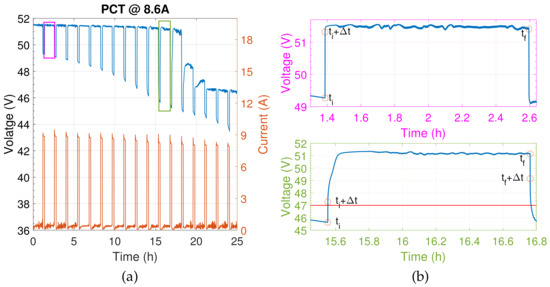 Figure 3. Current and voltage of string #1 in the pulsed current test used to estimate the model parameters. The battery pulse current value is 43 A, and the string current value is 8.6 A (a). Enlarged view of two pulses representing the contribution of the nickel reaction only (top) and both reactions (bottom) (b).
