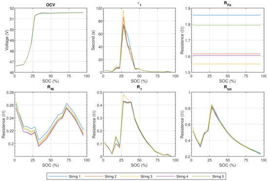Figure 4. OCV, R Ni , R 1 , τ 1 , R Fe , and R tot = R Ni + R 1 + R 2 identified with the data of the five strings acquired in the PCT with a pulse current value of 43 A.