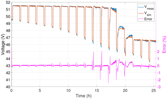 The comparison between the measured and simulated string voltages is reported in Figure 5, together with their difference that represents the error in the reconstruction of the battery behavior. The model response is rather accurate in this test, as the absolute value of the relative error remains lower than 1% for almost all the test. This error is consistent with the one obtained in [24], where the same model is used on a high-voltage series-connected battery. Instead, it is lower than the finding of [20], where a mathematical model is used. Moreover, it is comparable with the 4% error found with the electrochemical model presented in [18]. However, we note that the error is rather low until the occurrence of the iron reaction, i.e., when the battery voltage is above V Fe = 47 V . This fact suggests that the model accounts very well for the nickel reaction and is less accurate when both reactions occur.