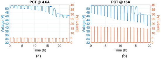 Figure 6. Current and voltage measured of string #1 of the battery in two pulsed current tests with different current amplitudes. The battery pulse current value is 23 A, and the string current value is 4.6 A (a). The battery pulse current value is 80 A, and the string current value is 16 A (b).