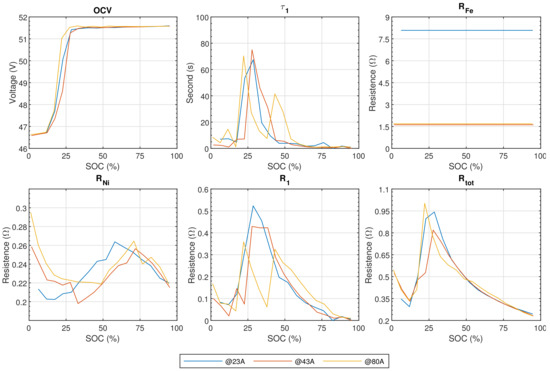 Finally, the other model parameters are obtained after the calculation of R Fe that is considered a global constant. The same approach described above is applied to every pulse. Each pulse corresponds to a well-defined SOC value.