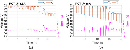 Figure 8. Comparison between the measured and simulated voltage of string #1 in the PCTs with a pulse currents of 23 A (string current 4.6 A (a)) and 80 A (string current 16 A (b)). The model and the measured voltages and their percentage error are shown.