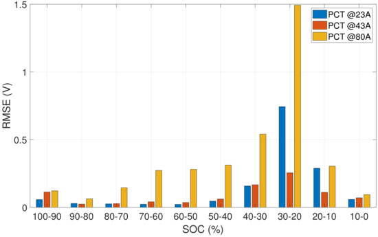 It can again be noted that the RMSE significantly increases for the PCTs carried out at both 23 A and 80 A current values. This fact is due to the dependence of the parameters on the current shown in Figure 7. The parameters identified in the 43 A test lead to a loss of accuracy when the battery operates with different discharge rates. Figure 9 finally shows the RMSE in the model reconstruction for string #1. The reconstruction is divided in SOC zones of 10% each, to span the entire SOC range. It is reported for the three experiments described. We note that the maximum values of the error occur around the 20–30% SOC zone, where reaction (2) takes place together with reaction (1). Moreover, the current rate is also important, as the error increases with the current rate down to 30% SOC, as the iron reaction is turned on earlier. The higher errors found in the tests around the 20–30% SOC zone at low and high current rates show the reduced accuracy of the model in that zone. The accuracy strongly depends on the test condition in which the parameter identification process was performed.