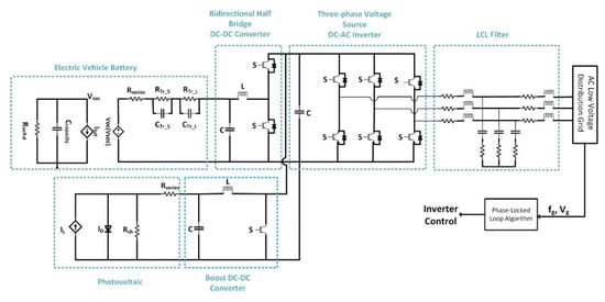 In this section, the understudy system will be analyzed. Figure 1 illustrates the topology of the DC nanogrid. It consisted of photovoltaic (PV) solar panels connected to the DC bus of the nanogrid through a Boost DC-DC converter. A bidirectional DC-DC converter was used to make feasible the exchange of active power transfer between the EV batteries and the DC bus of the nanogrid was achievable through the bidirectional DC-DC converter. The nanogrid was connected to the low voltage distribution grid through a voltage source DC-AC inverter and an LCL filter. The aforementioned configurations were briefly discussed in the following subsections while in Appendix A, the parameters of each topology are given. The nanogrid configuration was simulated in Matlab/Simulink.