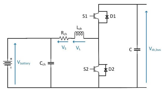 The bidirectional converter consists of one inductance (L), two capacitors (Cch, C) and two switching devices (S1, S2). During the V2G operation, the controllable switch is the S2 while the S1 is turned off when the EV battery is charging. The opposite control strategy occurs (S2 is off and S1 is the controllable switch) when the EV battery is discharging. In the current study, the nominal power of the charger was selected to be 6.6 kW. This value corresponds to a commercial EV charger. A complete design methodology of this bidirectional charger can be found in []. All the parameters of the bidirectional DC-DC converter are included in Table A4 in Appendix A.