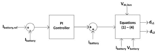 where Pref is the desired active power that should be transferred through the converter. Figure 3 illustrates the control scheme of the DC-DC converter. The Proportional-Integral (PI) controller eliminates the error between the measured and the reference current. Afterwards, the duty cycle was calculated based on the Equations (1)–(4) and the required measurements.