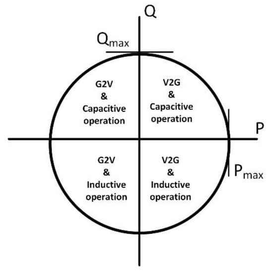 In the present study, a three-phase voltage source converter was used in order to connect the DC nanogrid to the utility grid. This topology was characterized by the four-quadrant operation. Thus, as it is illustrated in Figure 4, it was feasible to inject or absorb reactive power to the AC power grid during the V2G or Grid-to-Vehicle (G2V) operation.