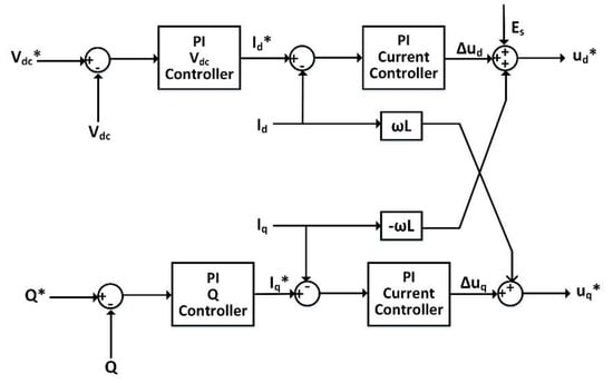In addition, PI controllers were deployed to set the values of q-axis and d-axis currents, the DC bus voltage (Vdc) and the reactive power (Q) to their reference value. The control system of the DC-AC inverter based on the equations above is given in Figure 6.