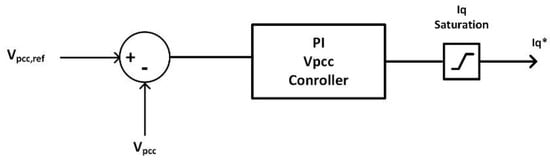 However, in this technique according to Equation (18) the value of the line inductance should be available to calculate the required reactive power to overcome possible voltage instability. In case that the value of this parameter is not available, the following control method is proposed. As it was mentioned before, the reactive power is controlled through the q-axis current (Equation (11)). Thus, the control system of the q-axis current can be modified as it is illustrated in Figure 8.
