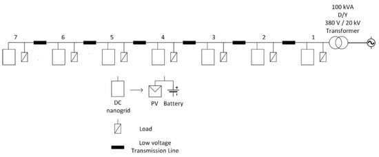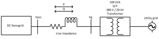 The topology that was studied in this section is illustrated in Figure 9. The DC nanogrid was connected to an AC bus of the low voltage AC distribution grid through its inverter as it was analyzed in the previous sections. The difference between Figure 9 and Figure 7 was that the DC nanogrid replaced the voltage V1 while the voltage source V2 was replaced by the AC bus Vg. Thus, the analysis and the equations that were described in the previous section applied in the current configuration. Additionally, the 100 kVA 380 V/20 kV distribution transformer stepped down the voltage from the medium voltage (20 kV) to the low voltage level (380 V). The grid impedance denoted as Lg in this scenario was considered pure inductive and equal to 0.5 mH. Due to the fact that the grid impedance was based on the theoretical analysis conducted in the previous section, the reactive power control method would be used. The purpose of the control method was to restore the Vpcc voltage to the nominal value in case of voltage sag or swell. In this study, a positive value of transferred value means that the nanogrid provides power to the utility grid while a negative one the opposite.