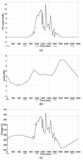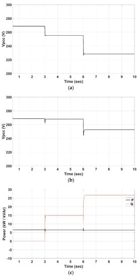 (a) The Vpcc voltage without voltage regulation. (b) The Vpcc voltage when the reactive power support is activated. (c) The transferred power through the inverter.