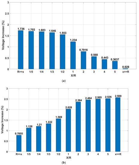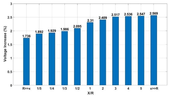 The topology that was used was the same as in Figure 9. The maximum active power that could be provided for voltage regulation was equal to the maximum power that could be transferred through the bidirectional EV charger and was equal to 6.6 kW. Thus, in order to have a fair comparison between the two methods, the reactive power transferred in this scenario was considered equal to 6.6 kVAr. The voltage drop that occurred was equal to 10% of the nominal voltage value. Figure 11 depicts how much the voltage increased when the active and reactive power support was activated for different X/R ratios.