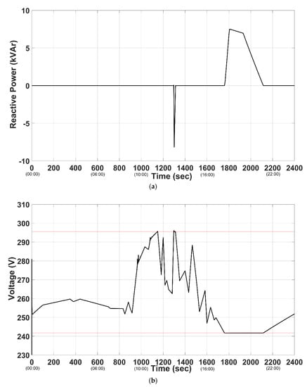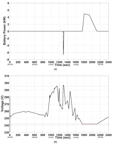 In this scenario, the voltage was decreased by 5% and 15% of the nominal value at the time t = 3 s and t = 6 s respectively as can be seen in Figure 10a. Concerning the active power, it was supposed that the EV batteries provided 6.6 kW while the PV system did not produce active power. At the time t = 3 s the voltage control system detected the voltage sag and the nanogrid provided 15 kVAr. In this way, based on Figure 10b, the voltage was restored to the nominal value. At t = 6 s the nanogrid provided more reactive power since a second voltage sag occurred. However, the voltage could not be fully restored to the reference value due to the reactive power limits (Equation (19)). Figure 10c depicts the transferred power through the inverter.