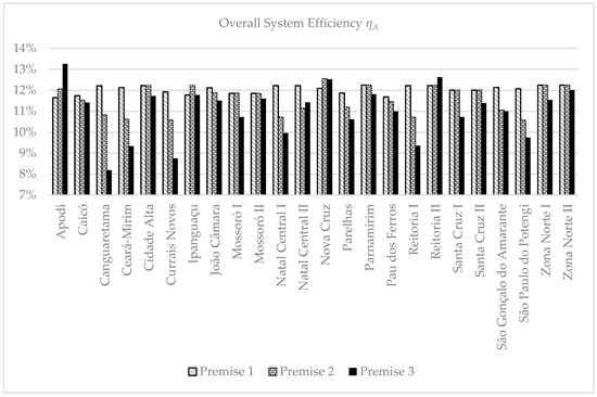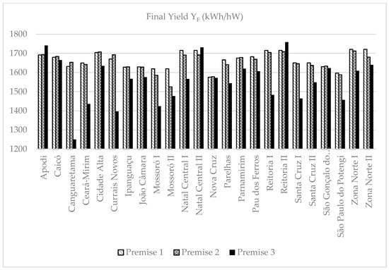 - Premise 1: assesses the energy production in the study localities by applying a standard system for all units. AC power production is estimated through the application of the PVWatts Performance Simulator, for each location where an IFRN unit is installed, applying common characteristics such as an installed capacity of 27,825 kWp and roof-installed photovoltaic panels at 10° inclination and 0° azimuth. This analysis aims to differentiate the theoretical yields of each location based on local climatic conditions, since the simulated system is common to all units.