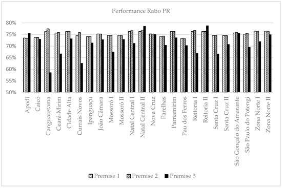 PR values are used to compare different types of photovoltaic system technology as a way to correlate system performance with local climatic conditions, carried out seasonally [40]. Annual PR value comparisons allows for indicative photovoltaic use performance evaluations, although this does not take into account the effect of possible park grid disconnection periods. The PR is useful in identifying problems such as inverter operation failures, module shading, diode failures and maintenance problems related to panel material deposition [41]. It, thus, allows for inferences on global system productivity loss effects [16].