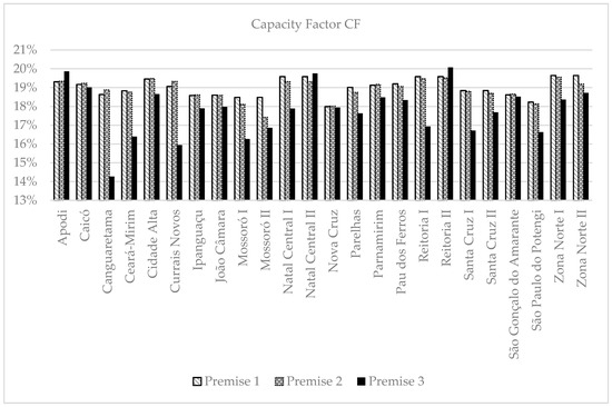 The Capacity Factor (CF) is defined as the ratio between the AC energy effectively produced by the photovoltaic system during a given period of time and the maximum generation capacity during that same period. Equation (5) expresses the Capacity Factor for an annual period: