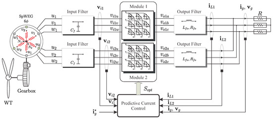 In this case, generated voltages by the SpWEG are indicated as , and where denotes the corresponding module. Input voltages of the MC are , and and input currents are , and , respectively. The output voltages of the MC with respect to the corresponding SpWEG neutral point ( or ) are , and . Moreover, output currents are , and , respectively. Finally, the output filter voltages (i.e., the connected to the grid or load side) are , and .