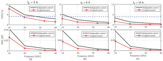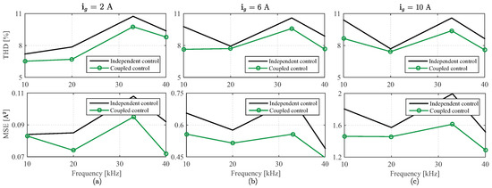 THD and MSE curves according to changes in switching frequency with fixed load. (a) For 2 A. (b) for 6 A and (c) for 10 A.