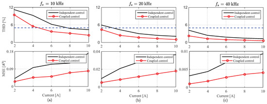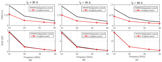 THD and MSE curves according to changes in switching frequency with fixed load. (a) For 20 A. (b) for 40 A and (c) for 80 A.