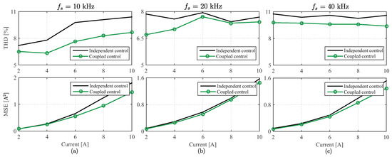 Figure 9 shows the oscilloscope measured currents for the proposed control technique, where is the current in module 1 following , is the module 2 current, following plus the predicted error in module 1. It can be noted that the total supplied current has a good tracking of the reference, but the currents of each module are different. The experimental results have been extracted with calibrated instrumentation equipment. THD and MSE were used as parameters to analyze the advantages of the proposed method. The first one considered as a performance parameter to observe the improvement of the proposed MPC variation, was obtained by taking 25,000 measurements of the signal with which the THD value was calculated, this process was performed 10 times, and finally the arithmetic mean of these 10 values was obtained, this is done for each analyzed scenario. On the other hand, the MSE, is used as a parameter for the analysis of experimental results in terms of error that the algorithm throws, integrating the proposed control with the drive, measurement and load modules. The arithmetic mean of a set of sample means of the MSE was calculated, since this is the best estimate of the population mean. The results of THD and MSE are shown in two figures. Here is important to mention that compared with simulation environment, experiments include the effects of the induced electrical noise due to the increase on the sampling frequency, that is expected in switched systems implementation. This issue can be diminished enhancing the shielding in wires and in the power stage. The measurement stage shows typical noise levels associated to this kind of applications. Due to these noises it is expected that the experimental results present higher levels in the target parameters than simulations. However, considering these error sources, the main aim in the experimental setup consist of shows the improvement of the proposal and, considering that the error introduced is the same in both techniques, the difference is the control strategy and the results allows to validate the phenomenon. Figure 10 shows how the improvement is achieved experimentally for all the considered sampling frequencies at different load currents in terms of THD and MSE reduction. Figure 11 shows the behavior for various operating points at the same sampling frequency. The experimental results allow to see that the proposal improves the performance of the predictive control reducing the THD and the MSE in all the analyzed cases.