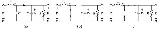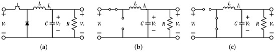 (a) Buck converter circuit. (b) Buck converter circuit for switched on condition. (c) Buck converter circuit for switched off condition.