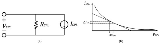 A power converter can be used to cause a CPL behavior in a microgrid. It is observed in a system whose feeder has a slower dynamic response than the load connected to the DC bus [3,6,9,14,15,28]. Figure 5a depicts the equivalent circuit and its response for the SSM of a CPL, considering that the power consumed by the CPL is indicated in Equation (15).