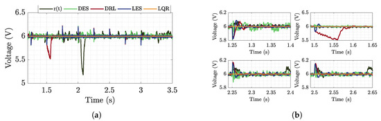Likewise, during the test, the controllers are able to mitigate oscillations by adequately regulating the voltage delivered to the DC bus, as shown in Figure 27a. However, looking at each variation window shown in Figure 27b, there are poorer mitigation performance and more oscillations. Anyway, the effect of a CPL using the boost converter is less noticeable, this can be due to two facts: